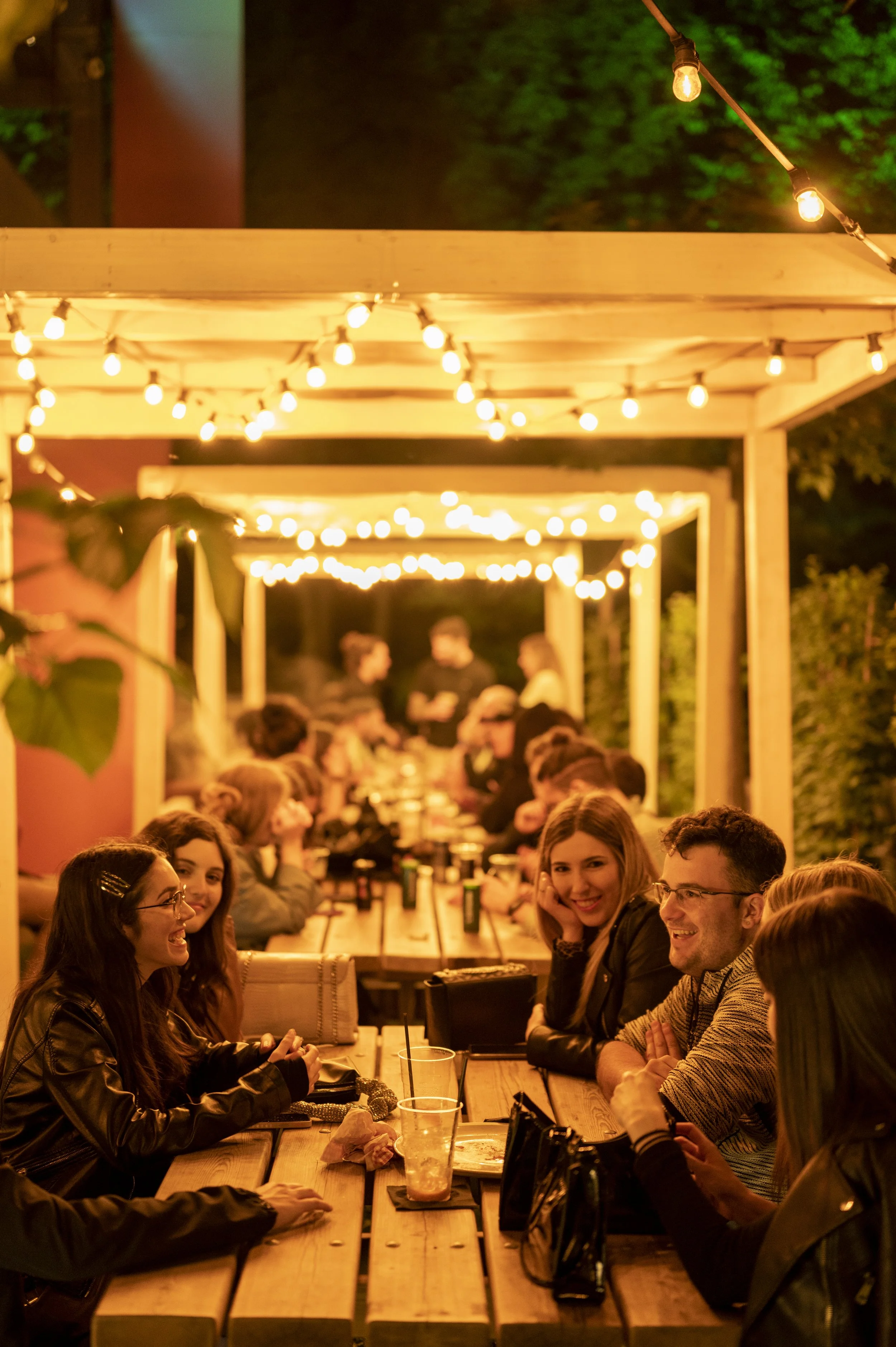 Lucine tra gli alberi, una grande fontana centrale e aree dedicate alla convivialità definiscono un’atmosfera curata ma informale, capace di accogliere pubblici diversi e momenti diversi della giornata.